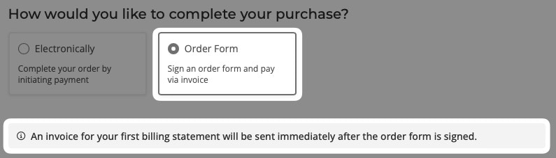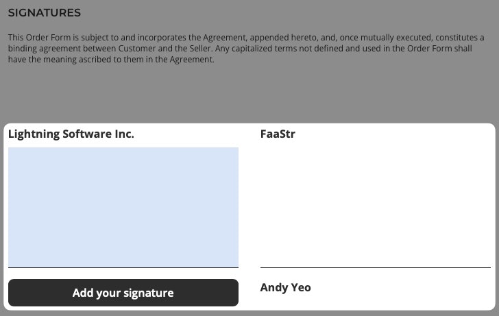 If your customer opts to complete the order via order form, they are prompted to provide an e-signature to begin executing the contract. Once signed by the customer, the order enters the countersigning phase for seller-side approval.
