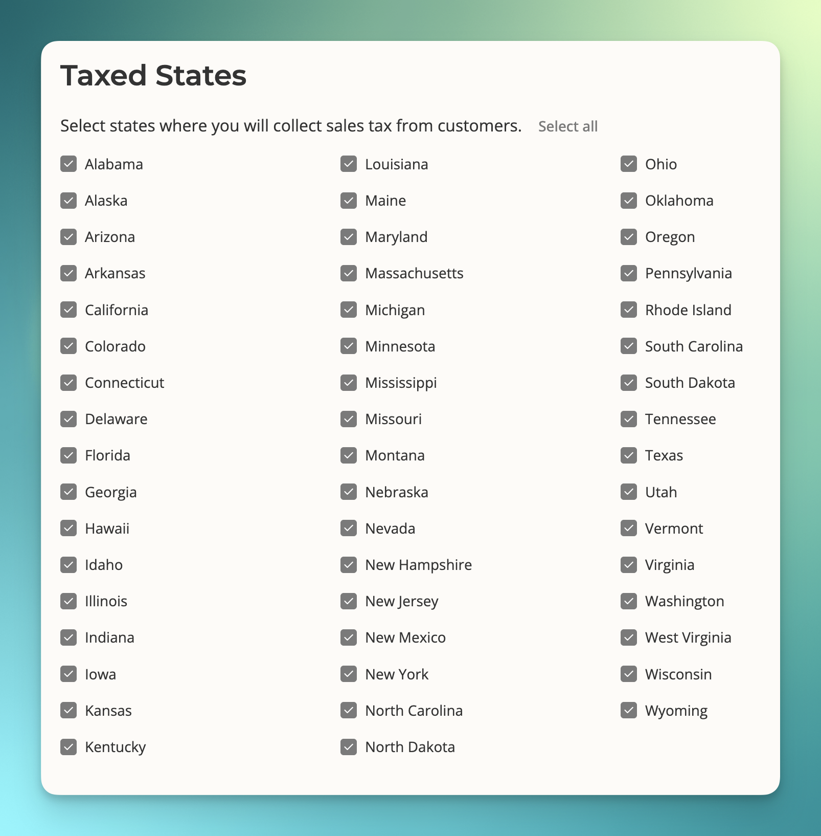 - Existing sellers: All states remain enabled for tax collection unless they choose to disable specific states manually.